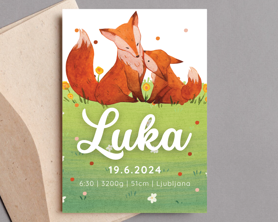 Personalizirana kartica ob rojstvu – Lisica 🦊 (digitalna verzija)